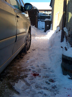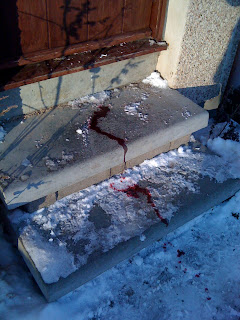 Now for the gory part. Please do not scroll down any further if you do not like blood. I decided to set up a fake accident for my son to find upon returning from school. It starts at the car with a blood spill: